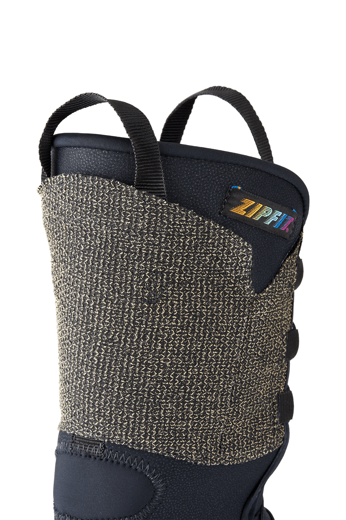 The ZipFit tongue is built to reflect the asymmetry in the shape of the lower leg, with more padding on the medial side along the tibia and less padding on the lateral muscle of the shin. The pull tab should be centered on the leg for the tongue to be in the proper position.