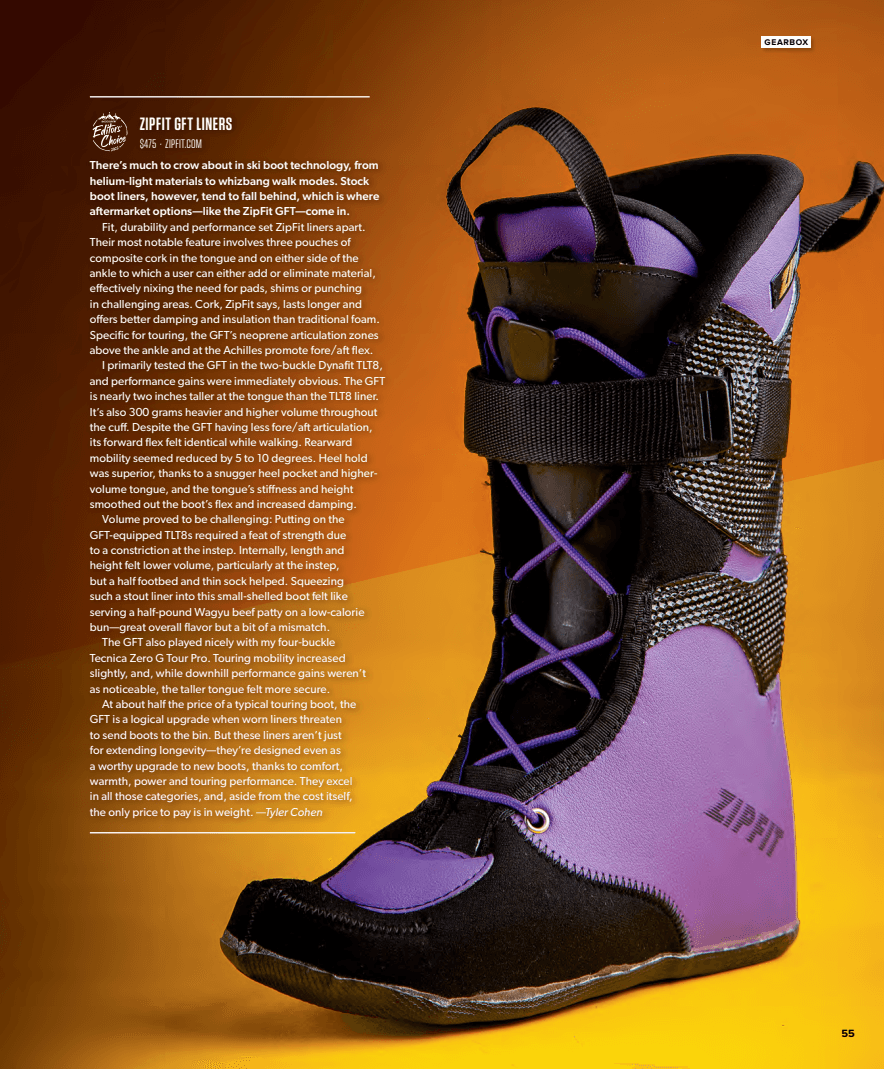 This past winter, Aaron was touring early mornings at Stowe and nearby Smuggler’s Notch when some of the editorial staff from Backcountry Magazine caught a glimpse of his GFT liners. It’s only fitting that the initial exposure of the GFT was at a trailhead, being used by a skier who uses his gear as much, if not more than every other skier out there. One thing led to another and we are pleasantly surprised and proud to share that the GFT was named Editor’s Choice by Backcountry Magazine.